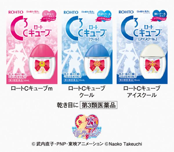 The collaboration also includes a partnership with the Rohto C³ brand of products for use with contact lenses. The Rohto C³ m, Rohto C³ Ice, and Rohto C³ Ice Cool products will be available in containers that feature Sailor Moon's transformation items.