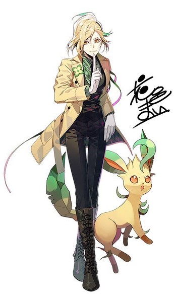 Joining the crew is Leafeon with their respective trainer drawn by Mai Hanamura. Hanamura is the original character designer for the Amnesia and Sengoku Night Blood otome visual novels. Leafeon's trainer, Hinata Asō, is a second year high school student, the student council president, and popular with girls. Hinata spent her youth in the Kalos region where her father is an important person within the area. His father became a target of a dangerous organization and so Hinata went into hiding, masquerading as a boy. She now exudes a mysterious, prince-like personality with her Leafeon.