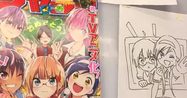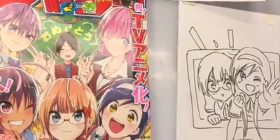 Tsutsui shared his happiness on Twitter on Monday with a live-drawing video. He draws a quick inked sketch of the manga's heroines Ogata and Furuhashi.