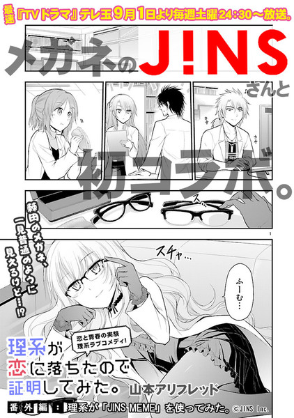 Alifred Yamamoto's Rikei ga Koi ni Ochita no de Shōmei Shite Mita (Scientists Fell in Love, So I Tried to Prove It) romantic comedy manga is collaborating with eyewear brand JINS. G-mode's Comic Meteor website posted a special manga for the collaboration on Wednesday.