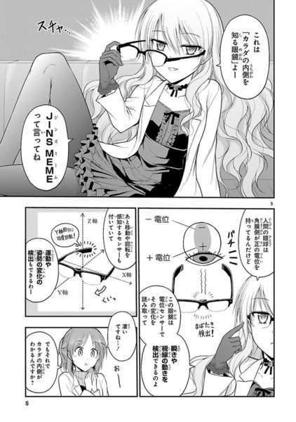 In the collaboration manga, the characters of Yamamoto's series try the JINS MEME device. JINS MEME looks like standard eyeglasses, but it can track the wearer's concentration, posture, and sleepiness by linking to an app.