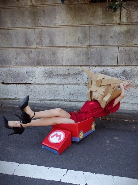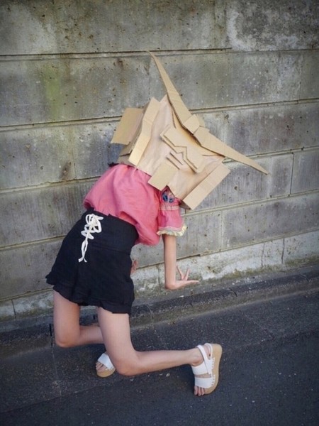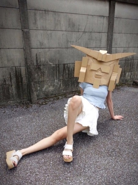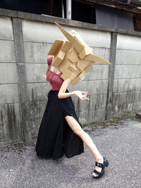 The user who calls herself Kidō Senshi Dundamchan remains anonymous by covering her head with a Gundam-inspired head made from cardboard. The user's name is very similar to Mobile Suit Gundam's Japanese name, Kidō Senshi Gundam. However, the first kanji character Dundanchan uses is changed to be the character for "clothes," and the first part of the word "Gundam" is swapped with the first part of the Japanese word for "cardboard."