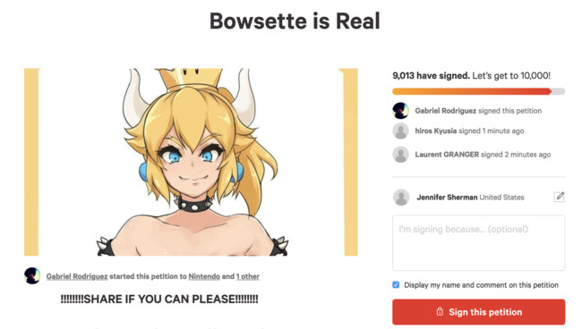 The unofficial character has gained so much popularity in such a short span that some fans want to make Bowsette official. A Bowsette fan named Gabriel Rodriguez started a "Bowsette is Real" Change.org petition to Nintendo and the meme's original creator @ayyk92. Rodriguez explained, "we hope Nintendo gives even a glimpse at this character, personally I would love to see her in Super Smash Bros. Ultimate even if it is only a thropy (sic) that way Nintendo may accept her existence slowly but surely." As of the posting of this article, the petition has received more than 9,000 signatures toward its goal of 10,000 signatures. At least two similar petitions have also been started.