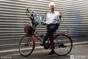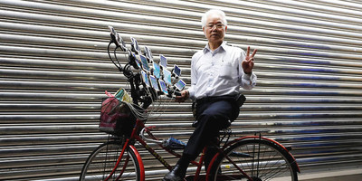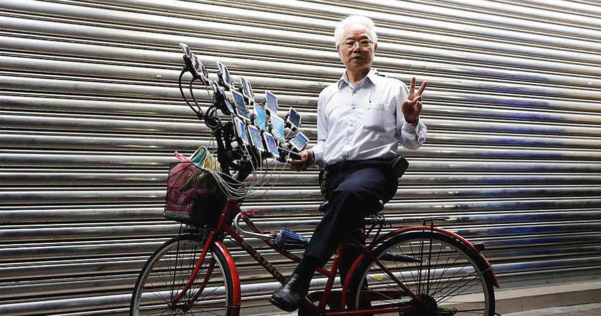 The "Pokémon Hunting Grandpa" Chén Sānyuán first started his Pokémon quest on his bike with a single smartphone but his mission to become Pokémon Master quickly expanded. Soon the number of phones grew from one to three to six to nine and eventually to his current number of 15 phones. Sānyuán arranges the phones in a fan shape that attaches to his bicycle and each is plugged into a battery supply in his bike's basket.