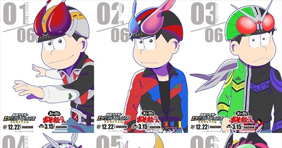 Mr. Osomatsu and Kamen Rider came together for the ultimate Tokusatsu Alliance! To celebrate the recent release of the Kamen Rider Heisei Generations FOREVER film and the March 15, 2019 release of Osomatsu-san the Movie, the characters appeared in a six-poster series to advertise the two movies.