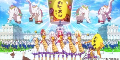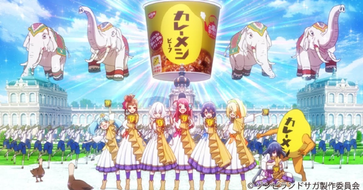 Nissin's Curry Meshi debuted its 30-second ad starring the undead idols of Zombie Land Saga. The Franchouchou idols dive into the instant meal and are transported to magical version of India. The news ong "Kagayaite (Curry Meshi ver.)" written by Zombie Land Saga opening theme composer Yūsuke Katō and lyricist Shin Furuya sets the scene.