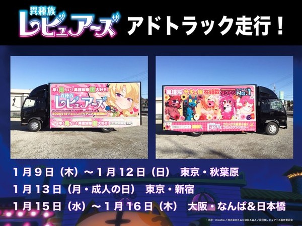 The Interspecies Reviewers anime will premiere on AT-X on January 11 and is currently being promoted with a truck displaying ads for the show and manga.