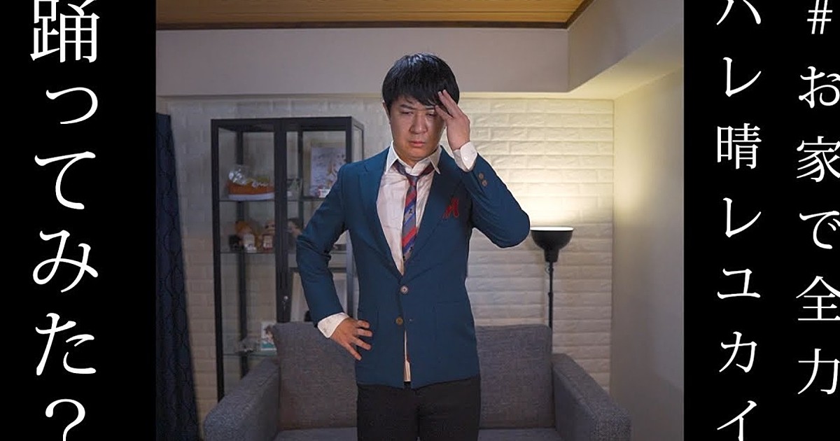 The videos are tagged with the hashtag #お家で全力ハレ晴レユカイ (Do the "Hare Hare Yukai" With All Your Might at Home) and show the actors putting a lot of energy into their movements. In Sugita's case, he even adds extra movements and makes goofy improvisions, but at one point he exaggeratedly strains his back and runs out of view of the camera. Eventually, he comes back into view and continues the dance while out of sync with the anime. The video ends with the message "STAY HOME."