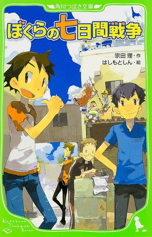 Kadokawa's children book adaptation of Osamu Sōda's 1985 novel Seven Days War was published in 2009 with illustrations by Shin Hashimoto. The mystery story and social satire begins on the day before summer vacation, when every boy in a first-year class of a downtown Tokyo middle school disappears. Was it some accident? A mass kidnapping? Actually, the boys holed themselves up in an abandoned factory on the riverbed. With support from the schoolgirls, the boys start a revolution against the adults from this "liberation zone."