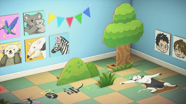 The theme of the island is the Galápagos Island depicted in the anime, where the characters test out the designs of the various living creatures that they have devised. Various characters and locations that appear in the anime, such as the banquet hall from episode 6 and the work room for the bug department. There is also a spot where you can take screenshots of your character with custom designs drawn by illustrator Namoko Machinami. Finally, the residents of the island will say lines associated with characters from the anime.