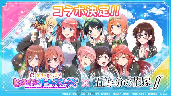 The Kanojo, Okarishimasu Heroine All-Stars smartphone game, based on Reiji Miyajima's Rent-A-Girlfriend (Kanojo, Okarishimasu) manga, already features crossover characters from other series that have appeared in Kodansha's Weekly Shōnen Magazine, such as Fairy Tail, The Seven Deadly Sins, and Fire Force. Now it will hold a limited-time crossover event with another beloved shonen manga romcom: Negi Haruba's The Quintessential Quintuplets.