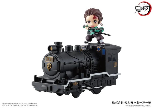 The toy is equipped with cars that can carry standard-sized sushi plates. It also comes with a figure of Tanjirо̄, who can be attached to the top of the iconic black Mugen Train. Tanjirо̄ and Nezuko-themed sushi plates are also part of the package.