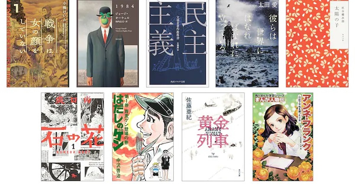 The works available for free include all volumes of Keito Koume's manga adaptation of Svetlana Alexievich's The Unwomanly Face of War history book, the first four volumes of Keiji Nakazawa's Barefoot Gen manga, all volumes of Hisashi Sakaguchi's Ishi no Hana manga, You Shiina's The Diary of Anne Frank manga, George Orwell's 1984 novel, Aki Satō's Ōgon Ressha novel, Ai Ōta's Karera wa Sekai ni Hanarebanare ni Tatteiru novel, Kenjiro Haitani's Taiyō no Ko children's book, and MEXT's Democracy book.