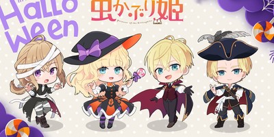 The anime of Satsuki Shiina's Bibliophile Princess (Mushikaburi-hime) light novel series is celebrating Halloween with a cute illustration of the Alan, Elianna, Christopher, and Theodore in spooky costumes.