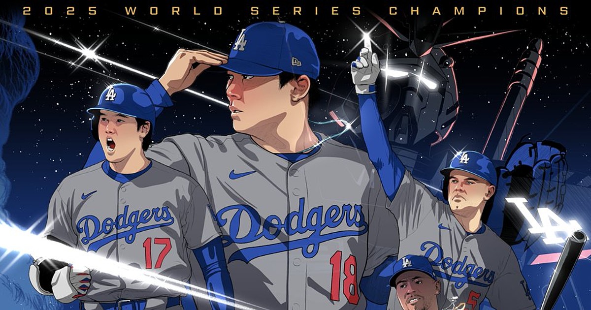 Following the Los Angeles Dodgers' back-to-back Major League Baseball (MLB) World Series wins, the MLB posted the team's championship illustration by local artist McFlyy on Wednesday. While fans were quick to congratulate the Dodgers on their achievement, astute anime fans also noticed a Gundam-lookalike robot in the top right corner of the illustration. The robot appears to sport a batting helmet (complete with a jaw-protecting C-flap), a vaguely bat-shaped beam saber, and baseball glove hand.