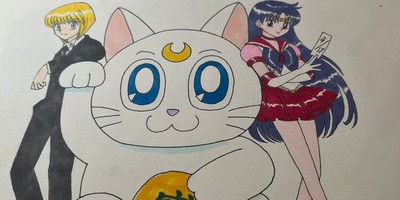 The illustration includes Hunter X Hunter character Kurapika and Sailor Moon characters Artemis and Sailor Mars. Artemis is in the style of a maneki neko (good luck cat) with its gold coin reading “Thanks,” while Sailor Mars is holding a charm that reads “4/17” (her birthday).
