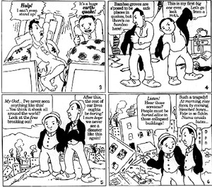 Before the first appearance of comic books in 1938, a comic artist could aim no higher than to have a super-popular newspaper comic. Yet the newspaper comics medium, even in that Golden Age, had both great promise and frustrating limitations. The promise included the fact that newspaper comic artists (more or less) owned the copyrights to their own work, unlike most of the creators of today's classic superheroes. The limitations included the fact that, despite their popularity, comic strips were still thought of as a children's medium. In Reinventing Comics Scott McCloud describes an encounter at a party between Will Eisner (1917-2005), a pioneering graphic novel creator, and Rube Goldberg (1904-1970), one of the most famous early newspaper comic artists. According to the story, Eisner started going on about the artistic potential of the comics medium, only for Goldberg to scoff at him and cut him off with "Cartoonists aren't artists! We're vaudevillians!" (http://en.wikipedia.org/wiki/Vaudeville) Some newspaper strip artists, like George Herriman and Winsor McCay, clearly thought of themselves as fine artists and not just entertainers, but almost no artists told lengthy, ongoing stories with real character development, beginnings and endings. Generally, they were not designed to be read for more than a few weeks at a time. There was no way for readers to go back and read a story from the beginning; even at the height of newspaper comics' popularity, very few of them were repackaged in book form. A comic strip might have ongoing storylines for a few weeks like a radio/movie serial, but almost never (except in Frank King's Gasoline Alley) would characters age, almost never would major characters die, and never, never, never would a strip have a real buildup, a climax and an ending. The syndicates who distributed newspaper strips were covetous of their spots on the comics page, and to end a strip would have been to give newspapers an opportunity to replace it with a strip from another syndicate—unthinkable! And so newspaper comics, long before the slow decline of newspapers themselves, entered a limbo where a strip was expected to be passed on to the creator's children, assistants, or just anyone, where a strip was eternal and unchanging and cobwebbby, where the characters never grew old. In Japan they call it "Sazae-san time," and yet Sazae-san only ran from 1946 to 1974, an eyeblink compared to Bringing Up Father or Hagar the Horrible.