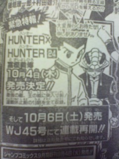 According to this image circulated by members of the 2 channel online community, Yoshihiro Togashi's popular manga series Hunter X Hunter will return to the pages of Weekly Shonen Jump on October 6.