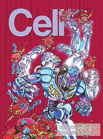 Manga artist Hirohiko Araki (JoJo's Bizarre Adventure, BAOH, Steel Ball Run) has drawn the cover of volume 130's issue 5 (available September 7) of the American biological journal Cell, at the request of two Japanese authors published in this issue. Dr. Mitsutoshi Setou and Dr. Hiroshi Ageta are part of a team that identified a protein named SCRAPPER that helps regulate synaptic activity in the nervous system. Among other potential benefits, the findings reported in the "Ubiquitin Ligase for Synaptic Tuning" article will aid research on Alzheimer's disease and strokes.