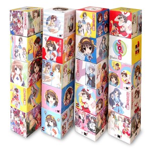 The Japanese store kamikau.com has begun offering The Melancholy of Haruhi Suzumiya tissue boxes in 20 different styles in an exclusive online sale that started on November 12. Each style sells for 525 yen (about US$4.74, tax included) and features artwork from the high school comedy anime series on five sides — and incidentally, 100 double-ply sheets of plain white tissue. A complete set of 20 boxes sells for 10,500 yen (US$94.75). The site also offers a tissue-box-sized acrylic case for 2,100 yen (US$18.95) to keep the tissue in mint, unused condition.