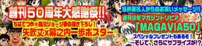 Kodansha's Weekly Shōnen Magazine will commemorate its 50th anniversary over the next five issues with the return of some of its most popular artists. Issue 16 (on sale on March 19) will have a poster featuring Ashita no Joe's title character Joe Yabuki and Hajime no Ippo's IPPO Makunouchi. Ikki Kajiwara and Tetsuya Chiba's Ashita no Joe is considered the pioneer of boxing manga, and George Morikawa's Hajime no Ippo is the most popular current boxing manga with 82 volumes so far and a hit television anime series. The issue will also have a "Magavia 50" feature on trivia about the magazine, with a review of the top models that appeared in the issues over the years.