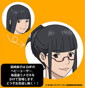 Not-So-Daily Link of the Day: Every week, the new Library War television anime series is outfitting a character with a different pair of prescription glasses from a store chain in Japan, and the chain is inviting fans to buy the real pairs. The science-fiction comedy series premiered on April 10 and centers on a military unit that protects libraries and freedom of expression from government encroachment. Asako Shibasaki (Miyuki Sawashiro), the roommate of the heroine Iku Kasahara (Marina Inoue), is wearing a different, newly designed pair of prescription glasses in every episode. Shibasaki's eyeglasses can actually be bought at Zoff, a chain of Japanese eyeglass stores. Takyuki Hamana (The Prince of Tennis, Sisters of Wellber) is directing this Production I.G production.