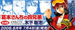 The August issue (on sale on July 4) of Shueisha's Jump Square magazine will feature the launch of the Kuzumoto Sanchi no Yon-Kyōdai manga by Dragonaut - The Resonance artist Satoshi Kinoshita, and the one-shot manga Sonezaki Shinjū by Ichigo 100% (Strawberry 100%) and Hatsukoi Limited creator Mizuki Kawashita. Kuzumoto Sanchi no Yon Kyōdai centers on four brothers who protect and enforce the peace in their town with secret powers. Kinoshita ended his manga adaptation of Dragonaut in Jump Square this past spring.