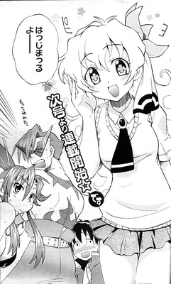 The September issue (released on July 26) of Kadokawa Shoten's Monthly Comp Ace magazine includes short previews for the new Gurren Lagann and When They Cry - Higurashi manga, both of which will officially start in the next issue on August 26. Tengen Toppa Gurren Lagann: Gurren Gakuen-Hen (Gurren School Edition) will feature the cast of Gainax's robot mecha anime in a school in a parallel world in multidimensional space. As the character Kamina puts it, the cast will "enjoy school life" and "sweat under the glittering sun." Kabao Kikkawa (Queen's Blade -Rurō no Senshi-) will draw the manga based on a story by A-ji Zaitsu. Bandai Entertainment staffers have indicated an interest in acquiring the main Gurren Lagann manga, which Kotarō Mori draws in ASCI MediaWorks' Monthly Dengeki Daioh magazine, but they also noted that other companies are interested as well.