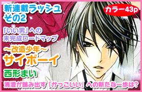 The February issue of Hakusensha's Hana to Yume magazine announced on Saturday that manga creator Mai Nishikata (Venus Capriccio, Sweet Black) will be launching her Kaizō Shōnen Cyboy (Rebuilt Boy Cyboy) series in the next issue on January 5. The Cyboy story originated as a one-shot manga that Nishikata drew for Hana to Yume's 2008 Xmas Present Stories booklet last month. The story centers on the "incomplete roadmap towards an ideal male."
