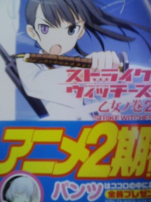 The April issue of Kadokawa's The Sneaker magazine will reportedly confirm on Friday that a second anime season of Strike Witches has been green-lit. The announcement is also said to be made on the wraparound jacket band (pictured at right) on Strike Witches: Otome no Kan 2 volume, which is slated for next month. The official website of the anime had promised that an important announcement would be made on Friday, although it also included a misleading message if a user were to advance his or her computer's clock to Friday.
