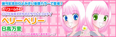 This year's 10th issue of Hakusensha's Hana to Yume magazine announced on Monday that V.B. Rose creator Banri Hidaka will publish a one-shot Berry Berry manga in the next issue on May 2. The 54-page "miracle comedy of cute twins" begins when a certain incident occurs at an amusement park during Golden Week. (Golden Week is the string of holidays that stretches from the end of April through the first week of May — which is also when the next Hana to Yume issue will ship.) Hidaka drew a previous run of Berry Berry about these twins, Hime and Kurumi Sasa, last spring.