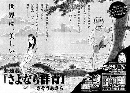 Akira Saso, the award-winning manga creator of Maestro, Kodomo no Kodomo, Shindō, and Fujisan, is launching a new manga called Sayonara Gunjō (Farewell, Ultramarine) in the 23rd issue of Shinchosha' Weekly Comic Bunch magazine on May 8. The story of innocence focuses on a boy stranded on a small island. The boy meets a female pearl diver — the first person he ever laid eyes upon, besides his own father. The encounter slowly makes the boy aware of the existence of the opposite sex.