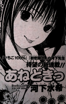 This year's 30th issue of Shueisha's Weekly Shonen Jump magazine announced on Monday that Ichigo 100% creator Mizuki Kawashita will launch her new manga called Anedoki—. The story will start in the 32nd issue on July 6 and will center on a boy who lives with a mysterious older sister. Besides creating the Ichigo 100% (Strawberry 100%) romantic comedy manga, Kawashita also created another romantic comedy manga called Hatsukoi Limited; both have been animated for television.