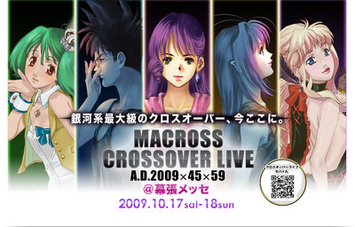 F-Tama, the official fan club for the Macross Frontier science-fiction anime, has announced to its members on Saturday that it is holding two "Macross Crossover Live A.D. 2009x45x49" concerts at the Makuhari Messe convention complex near Tokyo on October 17 and October 18. The "galaxy's biggest crossover" will feature Mari Iijima (Lynn Minmay in The Super Dimension Fortress Macross), Yoshiki Fukuyama (the singing voice of Macross 7's Basara Nekki), Chie Kajiura (the singing voice of Macross 7's Mylene Jenius), May'n (the singing voice of Macross Frontier's Sheryl Nome), and Megumi Nakajima (Macross Frontier's Ranka Lee). This is the second event to mark the "first year of Macross" after the Macross "space launching ceremony" in February. (The first episode of the first Macross series aired in 1982, but its story was set in February of 2009.) The first Macross Frontier film will open in Japan on November 21.