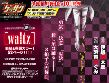 The October issue of Shogakukan's Monthly Shonen Sunday magazine has announced on Saturday that the writer/artist team behind the Maoh: Juvenile Remix manga are launching a new series called waltz in the next issue on October 10. Although Kōtarō Isaka is best known as a novelist, the waltz story will be an original work and not an adaptation of his previous novels. Megumi Osuga drew Maoh: Juvenile Remix before starting waltz.