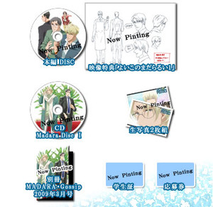 In addition to the actual Sex Pistols episode and the "Yoi Kono Madararui 1" extra, the limited edition of the first DVD volume will add a box illustrated by Kotobuki, a CD with the opening and ending theme songs, and a booklet illustrated by Kotobuki in the style of a gossip magazine supplement. The volume is also tentatively slated to include the school ID card of the character Shiro Fujiwara (Wataru Hatano), two "candid photographs" of the character Yonekuni Madarame (Tomokazu Sugita), and one of two mail-in cards needed for an accessory gift. The second and final planned volume will ship on June 25 with the "Yoi Kono Madararui 2" extra. The second volume's limited edition will add another box illustrated by Kotobuki, the soundtrack CD, another gossip-magazine-style booklet, Madarame's school ID card, two "candid photographs" of Fujiwara, and the last of the mail-in cards.