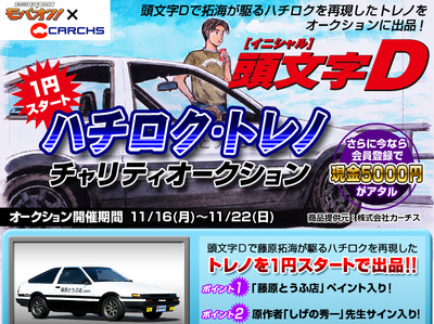 Not-So-Daily Link of the Day: The used car dealer Carchs is offering a replica of the Toyota Sprinter Trueno AE86 car from the Initial D street-racing manga and anime in a charity auction on the MOBAOKU mobile-phone auction website in Japan. The auction will run from November 16 to 22 with starting bid of one yen (about US$0.01). Like other replicas, this one has the words "Fujiwara Tōfu-Ten (Jikayō)" painted on its door. Unlike most other replicas, manga creator Shuuichi Shigeno himself signed his autograph on it and its owner's manual. Shigeno also signed a set of the manga, an Initial D: Battle Stage Special Box DVD set, an Initial D Official Guidebook, and a 1/24 Initial D AE86 Trueno plastic model for charity.