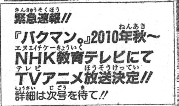 2010's second issue of Shueisha's Weekly Shonen Jump magazine is confirming on Monday that a television anime adaptation of Tsugumi Ohba and Takeshi Obata's Bakuman. manga has been green-lit for fall of 2010. It will run on the NHK-Educational channel. More details will be provided in future issues of the magazine.