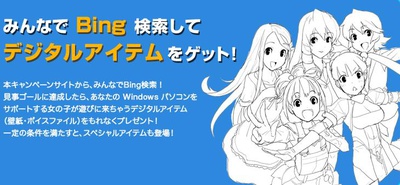 The Japanese version of Microsoft's Bing search engine service has enlisted voice actresses to help with a new campaign. If enough people use the search engine on the linked page by the campaign's deadline, January 18 at 6:00 p.m. Japan Time, then Microsoft will offer digital present items in the form of theme files with wallpapers and voice samples. Microsoft started the campaign on December 18. A progress bar, which can also be found on the linked page, is currently at 25 percent.