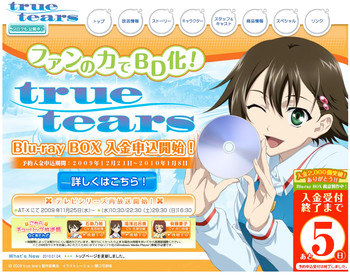 The official website for the True Tears anime series has confirmed on Monday that 2,000 Blu-ray Box pre-orders had been received — the minimum needed to give the planned Blu-ray conversion project the official go-ahead. The box will add about three minutes of new, unaired anime footage as an epilogue. The epilogue will depict the future of the main characters after the 13th and last television episode.