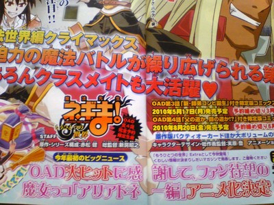 This year's 10th issue of Kodansha's Weekly Shōnen Magazine is announcing on Wednesday that an anime extra for the Mahō Sensei Negima!: Mō Hitotsu no Sekai original anime DVD (OAD) series has been green-lit for this Fall. The new anime will adapt the Ariadone magical girl arc from Ken Akamatsu's original Negima! Magister Negi Magi manga. According to the magazine, the extra is being produced to thank the fans for making the OAD series a hit. More details will be provided in the magazine in future issues.