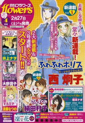 Keiko Nishi (Love Song, Kame no Naku Koe) will start a new manga called Fuwafuwa Police - Hirugaya-Eki-Mae Kōban Shimatsuki (Fuwafuwa Police: Chronicles of the Police Box in Front of Hirugaya Station) in the April issue on Saturday. The series will follow an odd couple of female police officers as they solve cases "with love and justice." In the same issue, a relatively new creator named Murako Kinuta will launch a manga called Sansukumi.