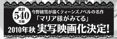 The 44th volume of the Cobalt Salon flyer for Shueisha's Cobalt Bunko novel imprint lists a Fall 2010 live-action film adaptation of Oyuki Konno's Maria Watches Over Us (Maria-sama ga Miteru) light novels. The light novels follow the personal relationships within the student body of Lillian Girls' Academy. The series has shipped 5.4 million copies and inspired four anime seasons.