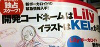 The June issue of Terajima Joho Kikaku's DTM Magazine announced on May 8 that a new Vocaloid virtual idol character, codenamed "Lily," is being developed. The Japanese illustrator Kei created the character designs for "Lily," just as he did for Crypton Future Media's previous Vocaloid characters Hatsune Miku, Kagamine Rin and Len, and Megurine Luka. The Character Vocal Series uses voice samples and Crypton's version of YAMAHA's Vocaloid software engine to create songs from scratch when ordinary computer users type lyrics and musical notes.