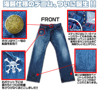 The back of the legs are printed the names and positions of the Straw Hat Pirates' crewmembers, and the waist has a design patch with a red straw-hatted skull-and-crossbones logo. The jeans come in 30-inch, 32-inch, 34-inch, and 36-inch waist sizes.
