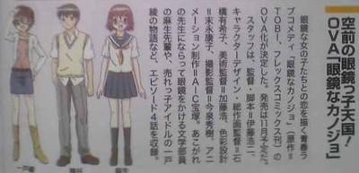 The September issue of Kadokawa Shoten's Newtype magazine is announcing on Tuesday that an original video anime adaptation of Tobi's Megane na Kanojo romantic comedy manga has been green-lit. The original manga was an omnibus-style collection of eight stories about girls with glasses — including a sempai, a tsundere (aloof and abrasive, but secretly affectionate), an airhead, an oneesan (older sister type), an elementary schoolgirl, and an idol. In particular, the anime's stories will include the literature club sempai and the popular idol from the first two installments of the manga.