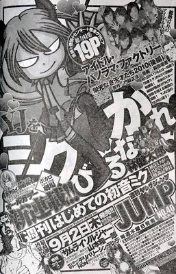 Hatsune Miku, the first popular Japanese idol singer whose "voice" is generated on-the-fly by computer software, will launch her first weekly manga in this year's 40th issue of Shueisha's Weekly Young Jump magazine on September 2. Kentarō Hayashi will begin the four-panel manga series with a full-color installment.