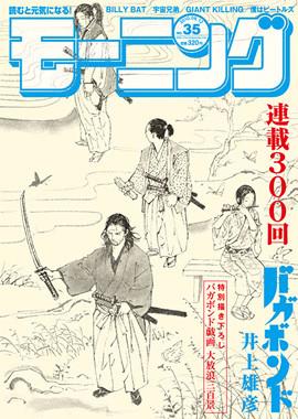 Vagabond last ran in this year's 35th Morning issue (pictured at right), which shipped on July 29. Inoue also drew the cover of that issue to mark the 300th installment of Vagabond. Inoue had announced that he would end the series this year, but his hiatus has delayed the planned finale until next year.