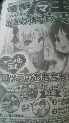 Advertising for ASCII Media Works' Dengeki Maoh magazine has announced that an anime adaptation of Yui Haga's Lotte no Omocha! manga has been green-lit. haga is the illustrator of the Baka and Test - Summon the Beasts light novels.
