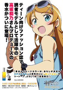 The international fashion and beauty supplier Cozy Wave has announced on October 15 that it is accepting pre-orders in Japan for an Ore no Imōto ga Konnani Kawaii Wake ga Nai (Oreimo) Aroma Fragrance based on the character Kirino Kōsaka. The 5,000-yen (about US$61, tax included) perfume opens with top notes of peach, orange, kiwi, and lemon and then continues with middle notes of jasmine, rose, and lily of valley. It finishes with base notes of musk and sandlewood.